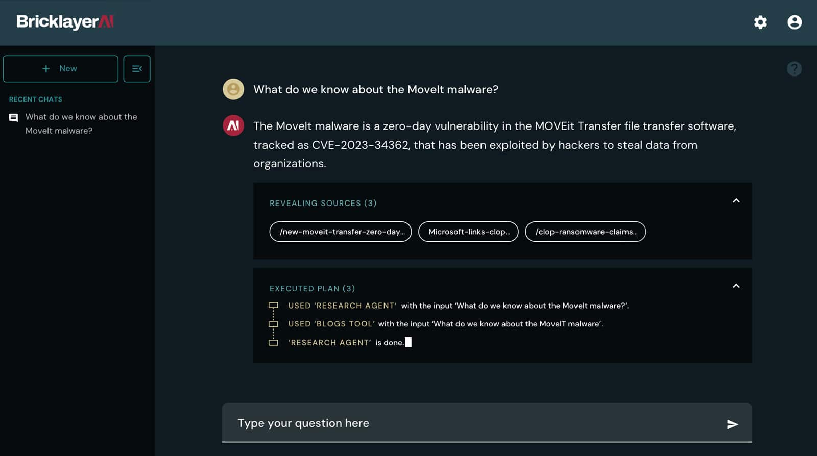 - Utilize Brickleyer plugins to connect to your existing technology APIs for natural language based question/answer capabilities across your security products.