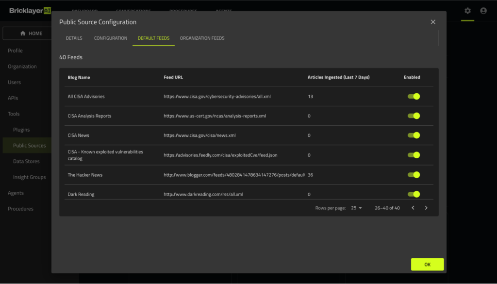 Brickleyer AI provides a preconfigured set of feeds, including public knowledge sources such as CISA, Hacker News, and Dark Reading. Each can be enabled or disabled individually. Teams can also customize by adding additional URL-based feeds through a simple interface.