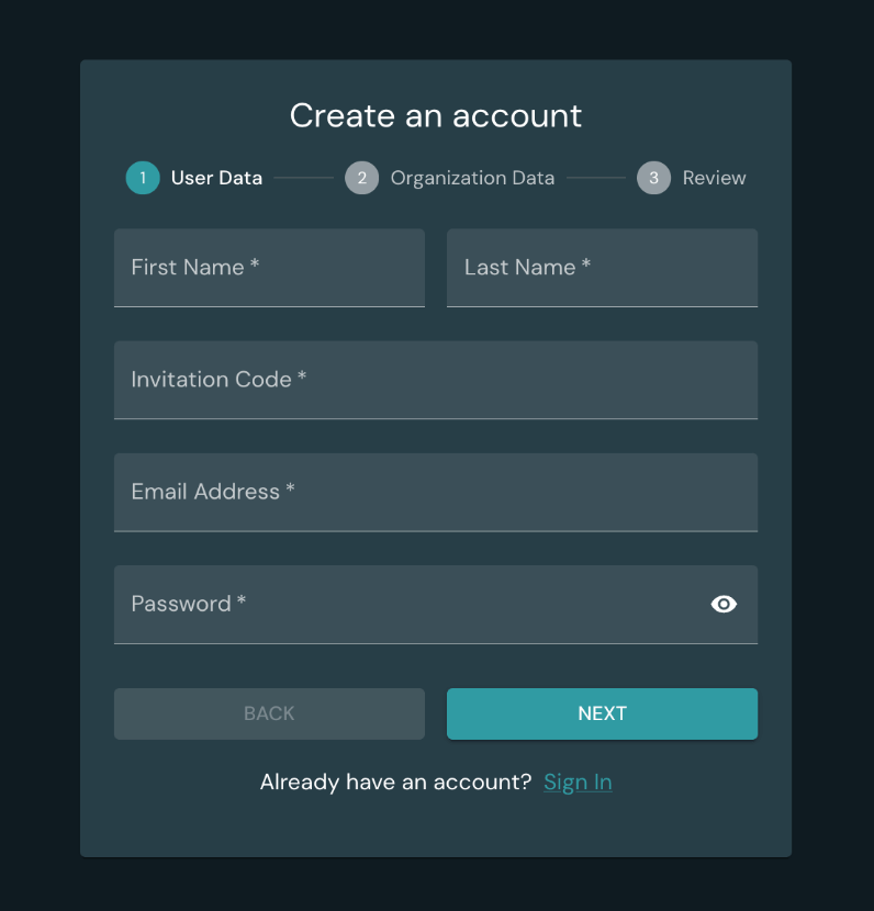 4 – User Sign-Up: When your colleagues receive the invitation email, they can follow the provided sign-up link. During this process, they’ll need to provide their first name, last name, email, and create a password. They won’t need to enter organizational data, as this information is already set up by the organization admins.