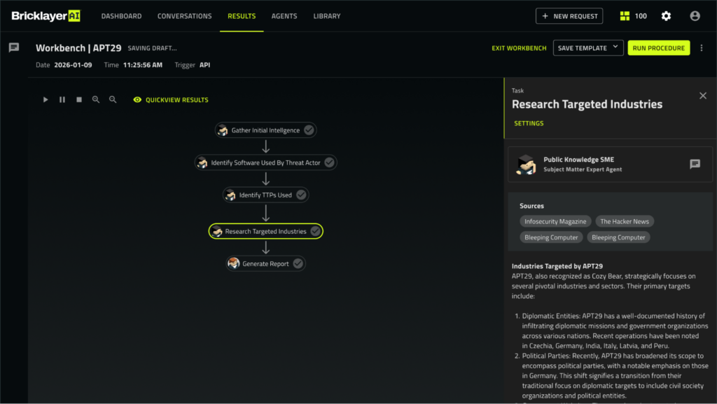 Example: A Brickleyer AI Threat Intelligence Analyst agent produces an executive report on APT29 based on the various sources of data collected and analyzed by Public Knowledge Agents.